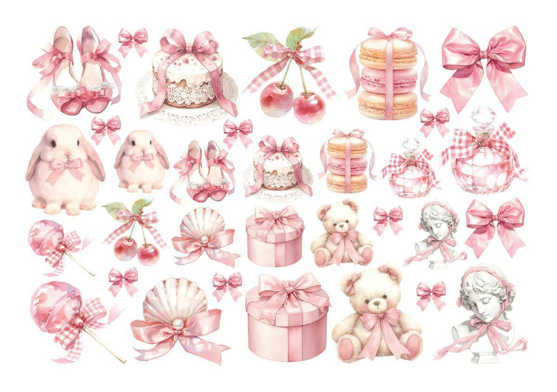 【白磁用】ラブリーガーリーリボン転写紙 (ポーセラーツ 転写紙 ポーセリアート リボン クマ ウサギ ケーキ マカロン 香水瓶 貝殻)